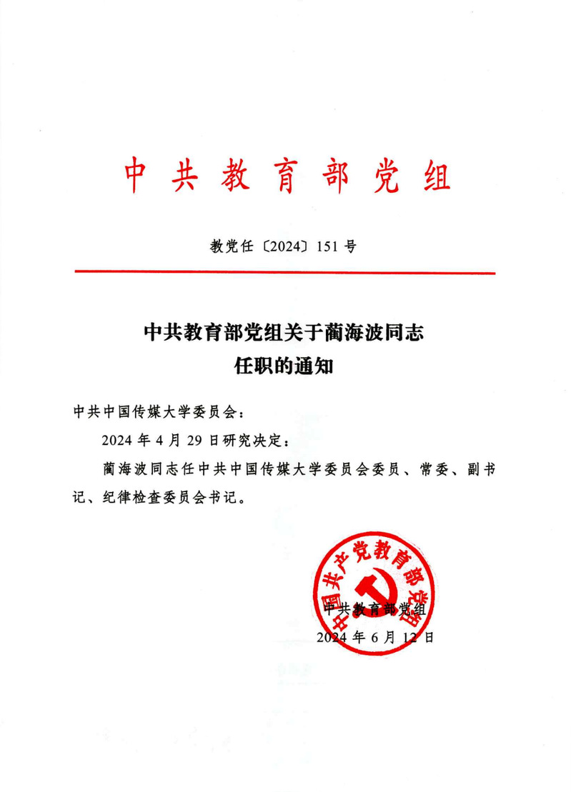 2024年6月19日,学校接教育部通知,研究决定:蔺海波同志任中共世界杯直播在线观看委员会委员、党委、副书记、纪律检查委员会书记。