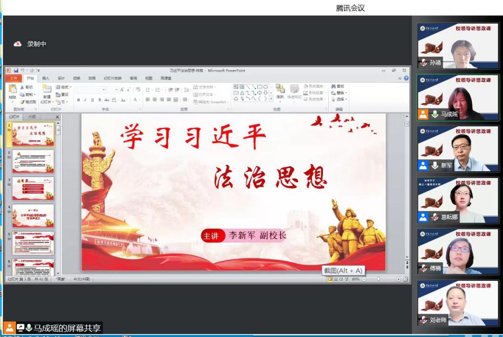 (通讯员 孙靖)6月7日上午,李新军副校长走进本科生《毛泽东思想和中国特色社会主义理论体系概论》课堂,讲授“学习习近平法治思想”云端思政课,全校13个教学班400余名本科生共同在线聆听。这是李新军副校长本学期...