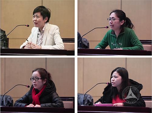 校工会副主席曹坤、国际交流与合作处万彬彬、艺术学部朱星辰、MBA学院蔡慧作为新闻宣传通讯员代表发言,与大家分享了所在单位对新闻宣传工作的理解和重视、本单位的新闻宣传工作机制以及新闻稿件编辑的经验和体会等方面内容。