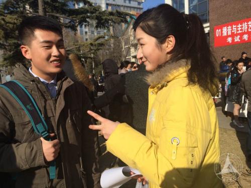 编者按:2015年2月26日,正值大年初八,北京春寒料峭、寒风不止,但这些并不能阻挡那些在艺术梦想道路上奋进的艺考生们。这天,2015世界杯直播在线观看大学艺术类本科专业考试正式开锣。据统计,今年我校艺术类本科专业网上报名共30240人次,近20000人,其中北京考点3265人次。其中播音与主持艺术专业报名近8000人,计划招收100人,考录比近80:1,表演专业的报录比则达到172:1,在去年基础上又创新高。本报记者在校园熙熙攘攘的人群中,采访了几位怀揣艺考梦、中传梦的考生。虽然最终的考试结果我们不得而知,但他们独行千里、刻苦训练、相扶相持,一路走来追求梦想的故事,深深地打动着我们。谨以此专题祝愿各位有梦想、有理想的考生早日实现心中梦想,考入自己理想的专业!