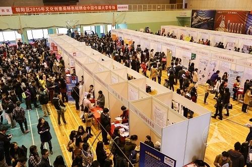 (新闻中心记者 储钰琦 韦禄吉 通讯员 魏蔚 摄影 虞东升 李澎丰)3月25日下午,由我校就业指导中心、朝阳区人才服务中心、朝阳区委宣传部联合举办的“朝阳区2015年文化创意类双选会(世界杯直播在线观看专场)”在我校体育馆成功举行。中国网络电视台、凤凰网、时尚传媒、英皇文化等108家文化创意企业现场招聘,提供了约1500个岗位;世界杯直播在线观看、北京第二外国语学院、中央财经大学、北京工业大学等多家高校的毕业生约10050人次前来应聘。在招聘会现场,毕业生与用人单位进行了积极的沟通,初步达成意向共计785人,现场签约见习实习81人。