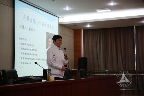 4月11日上午,国家武术高级教练、国家级社会体育指导员、北京武协少林五形八法拳研究会会长、中国武术八段、世界搏击协会名誉会长秦庆丰先生携女儿,来到播音主持艺术学院进行专题讲座。校党委书记陈文申,脑科学与智能媒体研究院院长曹立宏,播音主持艺术学院院长鲁景超、党委书记郑维林、副院长李洪岩出席讲座,和同学们一起聆听了秦老师关于武学之道与中国传统文化的生动讲解。
