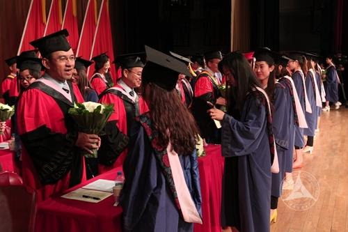 在热烈的掌声和欢快的乐曲声中,毕业生代表向校领导、校学位委员会委员、各学部(院)领导及导师代表敬献了鲜花。