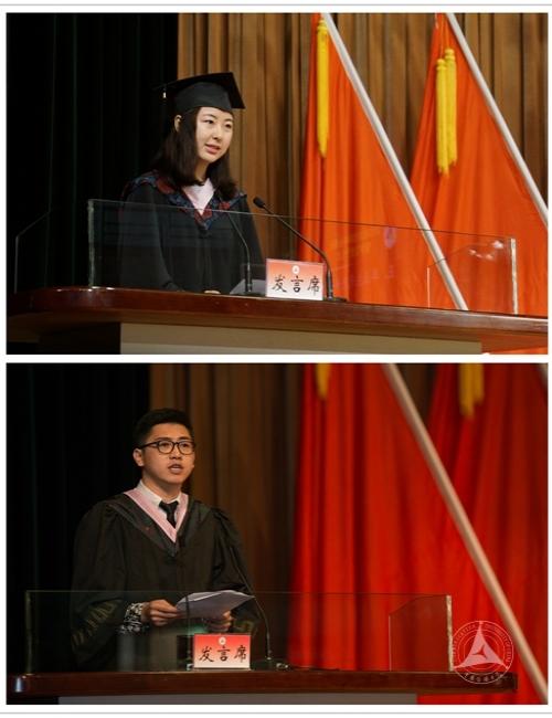 艺术学部戏剧影视学院2011级戏剧影视文学专业张译文同学、新闻传播学部电视学院2011级广播电视编导(电视编辑方向)吕振男同学代表毕业生发言,表达了对大学生活的无限眷恋以及对母校辛勤培育的衷心感谢,并表示将不忘师长的教诲和母校的嘱托,牢记“立德、敬业、博学、竞先”的校训,做有责任、有担当、有水准的传媒人,用实际行动为母校增光添彩。