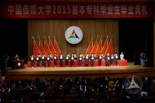 毕业典礼分两场进行,在合唱《中华人民共和国国歌》中拉开帷幕,由副校长胡正荣主持。