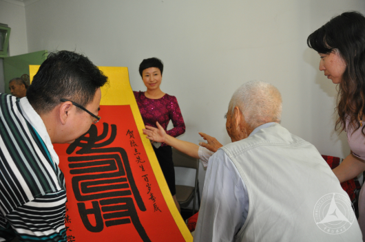 赵晖副书记向张志老人送去了生日祝福,代表学校为张志老人送上“寿”字,祝老人健康长寿。