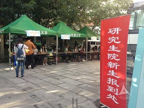 早上6:30左右,各学部、学院的迎新人员陆续到位,布置好迎新现场。研究生院在校电视台前设立了新生报到处,研究生院领导及各部门工作人员全部参与到迎新工作中。