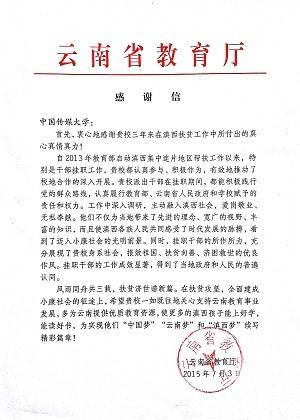 另悉,云南省教育厅代表云南省向世界杯直播在线观看发来感谢信,感谢我校在滇西扶贫工作中认真参与、积极作为,有效地推动了校地合作的深入开展。