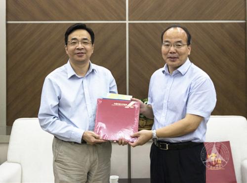 黄峥参赞向刘守训副书记(右)赠送外交工作相关书籍