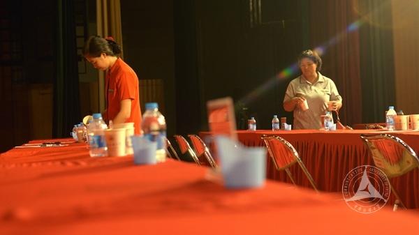 后勤服务人员提前一天就做好了场地布置、鲜花摆放、卫生保洁等工作。在报告厅正面的两个入口还分别放置了热水壶,一次性纸杯和袋装泡茶。盛开的鲜花、多姿的盆景将报告厅装点一新。尽管户外初秋凉意袭人,还淅淅沥沥地下着小雨,但会场地面整洁、桌椅有序、温暖宜人。