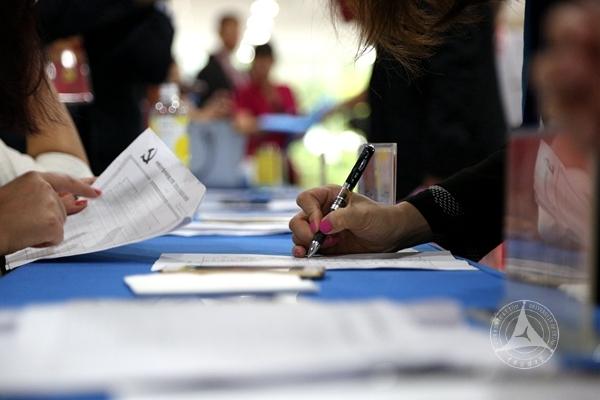 工作人员为签到完毕的党代表每人发放一个文件袋,其中包括:两委报告各一份、代表证、一支笔、一个笔记本、一份会务手册和一份合影方案。