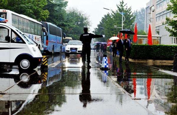 早上7时,各相关部门工作人员就已陆续到位,开展一系列会议服务工作。会场外,安保人员冒雨对道路交通采取了相应管制措施,引导参会代表有序停靠车辆,为大会顺利召开“保驾护航”。