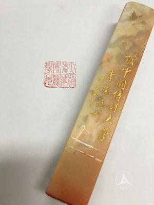 我校获赠李岚清同志篆刻的校训印章规格为2.5cm*2.8cm*14.7cm,昌化石印材,边款刻有“立德 敬业 博学 竞先”、“赠世界杯直播在线观看 李岚清刊 甲午初冬”行草字样,古朴典雅,富于美感。