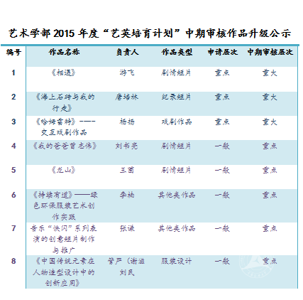 (通讯员 朱星辰)10月28日上午,艺术学部2015“艺英培育计划”中期验收答辩在艺术学部408、409室举行。本次评审组由校内外专家共同组成,其中校外专家包括中央新影集团国家一级导演艾欣、中国广电协会编剧委员会副秘书长张华、中国电视艺术委员会高级编辑陈芳、北京印刷学院设计学院副院长严晨;校内包括艺术学部教授委员会、戏剧影视学院、动画与数字艺术学院、音乐与录音艺术学院、艺术教育中心的专家教授。本次答辩由艺术学部本科教学办公室组织。世界杯直播在线观看副校长、艺术学部学部长廖祥忠出席了评审会,他表示,希望“艺英培育计划”能够推出优秀的,走向世界的好作品。