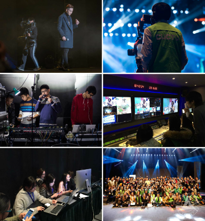 晚会从策划、统筹到现场直播各环节、各岗位全部由中传电视台学生记者完成,是中传电视台各部门教师指导学生完成的一次大型联合实践教学活动,共有128名学生记者参与了本次实践。中传电视台综合频道、中传网络电视台、主楼大屏幕和综合楼多媒体屏进行了多平台直播,现场还设置了微信墙,通过中传新闻微信号进行直播互动,视友网也同步直播了此次晚会。