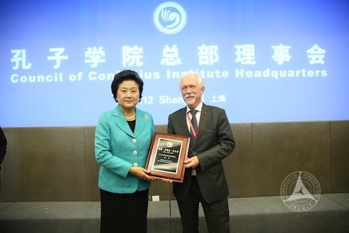 主旨发言后,刘延东副总理为全球孔子学院先进个人和先进单位颁奖。我校荷兰格罗宁根孔子学院喜获“先进孔子学院”殊荣,同时格罗宁根大学波佩玛校长被吸纳为孔子学院总部理事会理事。全球每年五百余所孔子学院中,每年只有20所获先进孔子学院称号。