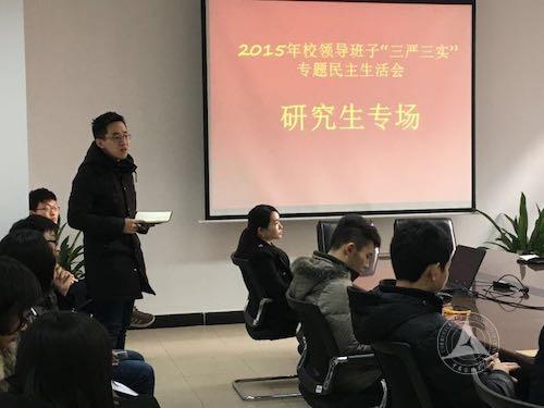 会议由校党委研究生工作部部长史萍主持,各学部(中心、直属学院)的研究生代表围绕“三严三实”(“严以修身、严以用权、严以律己,谋事要实、创业要实、做人要实”)的要求,着眼于宏观校情,就教育教学改革、促进内涵发展谈了自己的心得体会。