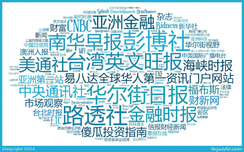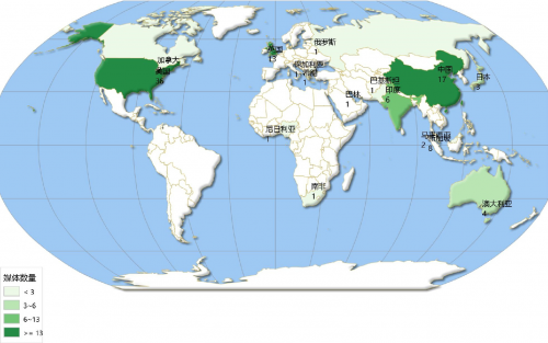 在排名前100家英文媒体中,美国媒体最多,有36家;其次是中国和英国,分别有17家和13家。第三是新加坡和印度,分别有8家和6家。需要特别指出的是,在17家中国媒体中,大陆媒体(7家)在总数上略胜于台湾地区的媒体(6家)和香港地区的媒体(4家),但没有一家能挺进前十名,整体上也不及港台地区,排名最前的大陆媒体是财新网,位居17名,2015年全年提及量为221次,不及《台湾英文旺报》、香港的《南华早报》和台湾的 “中央通讯社”的网站;其次是新华社网站,位居33名,提及量为134次,不及《台北时报》和香港的《信报财经新闻》的网站;第三是中国国际广播电台国际在线和中国新闻网,分别位居38名和39名,提及量为116次和116次,不及香港的中国金融投资网;最后是《中国日报》、《环球时报》和《上海日报英文版》的网站,分别位居49名、69名和73名,提及量为100次、72次和69次。