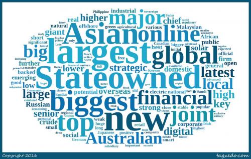 2015年中国企业在全球英文媒体(包括网站)新闻文本中“新”(new)、“最大”(largest 和biggest)、“国有”(State-owned)、“亚洲的”(Asian)、“全球的”(global)、“在线”(online)、“移动”(mobile)等成为名列前茅的八个高频形容词,这也集中体现了中国企业国际传播的显著特征。从词频总量上看,排名前五名的形容词为New 、largest、 State-owned、Asian和 biggest,均过千次;随后top、 global 、online 、joint、financial和mobile等过五百次,位列前十二名,这些词还表明了顶级、合资、金融等特征;而过100次的Australian、central、local、latest、Indian、European、English、large和leading等词则展示出全球化、本土化和引领性等特征。