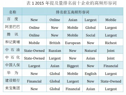 2015年度提及量排名前十企业的高频形容词体现得更为明显,首先,在前十家企业的高频形容词中,形容词“New”始终在榜,不仅出现在“BAT”、华为等信息通讯企业中,能源、金融类企业也未曾缺席。“新能源”、“新市场”、“新机遇”等词屡见不鲜。同样反复出现的还有形容词“Largest”、“Biggest”,体现出中国企业体量大、规模大、影响大的特点。其次出现多的高频形容词是“online”和“mobile”,这不仅是因为前十家企业中信息互联相关的企业占据近一半,也因当今媒体更关注移动终端、移动互联网。再次是“亚洲的”和“全球的”。统计结果发现,“Asian”和“Global”也是名列前五的高频词,这说明中国企业不仅立足于亚洲,显然也已经拥抱世界,而 “European(欧洲的)”、“British(英国的)”、“Russian(俄罗斯的)”等高频形容词也体现这些企业的跨国性。最后是“国有的”( State-Owned)一词,这道出了中国企业在国际传播话语中的典型特征,也是因国企在前十家企业中就占了四席。