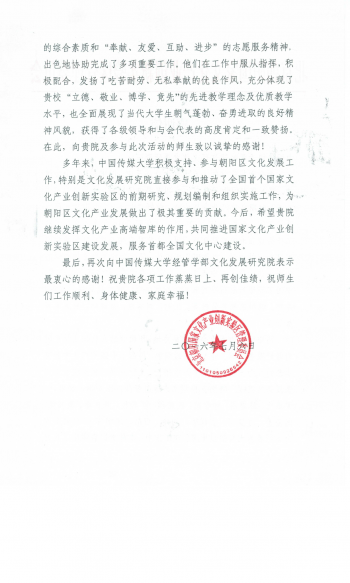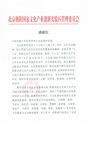 附:北京朝阳国家文化产业创新实验区管委会感谢信