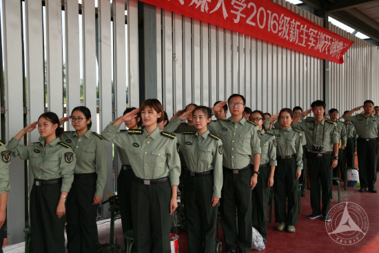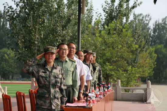 伴着庄严的国歌声,军训开训典礼于下午三点隆重召开。全体新生在操场整齐列队,背向阳光、面向主席台就坐。校党委副书记刘守训教授,学生工作部(处)张根兴部(处)长,教务处金雪涛副处长,学生工作部副部长兼武装部部长、2016级军训团齐金贵政委,军训团孙广积团长,校军事教研室主任、军训团王京明副团长,马千里参谋长,基地刘洪艳书记等领导出席。