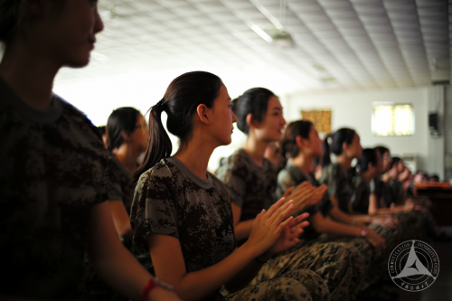 在教官的带领下,同学们继续练习着军姿、停止间转法、齐步走等基础的队列科目,同时又学习了校歌。