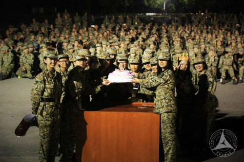 当同学们以为晚会就要结束的时候,播音主持艺术学院贺敬杰老师出现在主席台,他总结了同学们来到基地这十几天的表现,并说要“随机”从各连中选取几位同学到队伍前面进行即兴表演。当66名同学满心忐忑地来到台前时,贺老师却说:“这些是在我们军训期间过生日的同学,我们一起为他们过一个难忘的生日吧!”顿时全场沸腾。惊喜之余,大家报以更加热烈的欢呼。在贺老师的提议下,全体师生唱起生日快乐歌,共同祝愿这66名同学生日快乐。