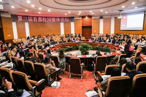 当晚,第三届首都校园媒体论坛在图书馆圆形会议厅举行,来自京内外二十余家校园媒体代表就“校园新闻深度报道与特稿创作”和“校园新媒体经营与传播”两个话题展开讨论。多家校媒进行了主题发言,中央人民广播电台资深记者王亮对同学们进行了点评和鼓励。