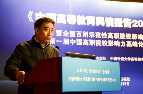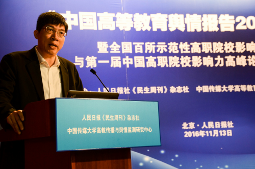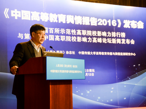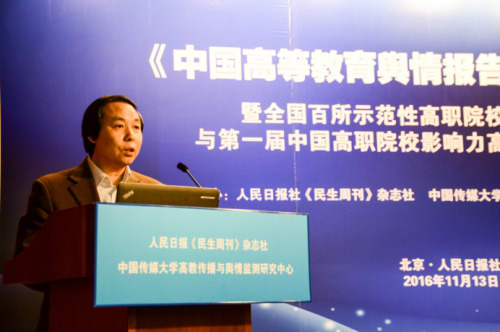 (通讯员 王保华)11月13日,由我校高教传播与舆情监测研究中心与人民日报《民生周刊》杂志社联合主办的“《中国高等教育舆情报告2016》暨全国百所示范性高职院校影响力排行榜与第一届中国高职院校影响力高峰论坛新闻发布会”在人民日报社举行。