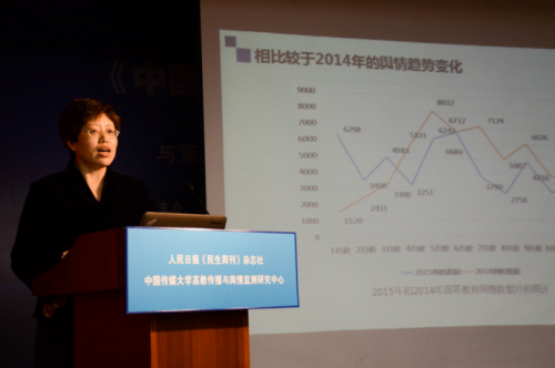 高教传播与舆情监测研究中心谷俊明对《报告》进行了解读,指出本书具有三个亮点:理论与实际相结合、用数据和事实说话、力求创新的原则;同时介绍了2015年高教舆情发展的总体态势,并发布十大舆情热点事件,对高校舆情监测管理进行了具体分析,并提出了舆情治理的关键环节等建议。