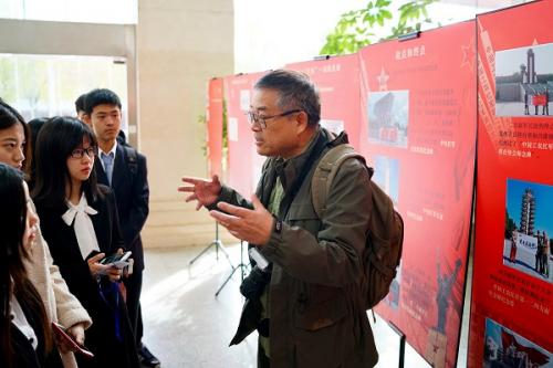 本次报告会开场前,田竞老师还在综合楼一层的“重走长征路”图文展示现场向同学们讲解此次自己重走长征路的所见所闻,传播长征精神。