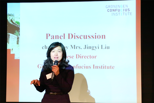 (格罗宁根孔子学院中方院长刘婧一发言并主持小组讨论)