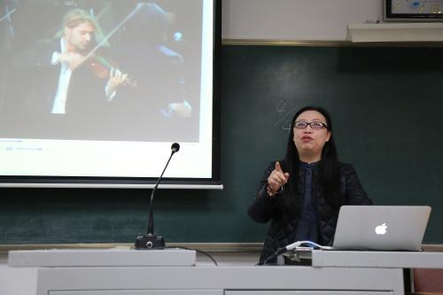 王铉老师的《电子音乐作曲》课程侧重教学模块的设计,并与国际接轨,加入了kyma等新内容与制作理念。现场示范20分钟,王铉老师讲授了《创作中的节奏节拍设计》,她向观摩师生介绍了节拍的类型,并以拉罗·希福林等名家作品为例具体讲解节拍的体现,还现场运用软件演示了如何将4/4拍细化为不同的丰富节拍,生动展示了重音-细分-重组的创作意识和创作技巧。