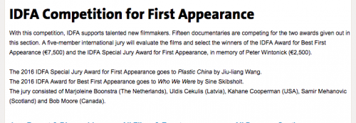 阿姆斯特丹国际纪录片节网站链接:https://www.idfa.nl/industry/festival/program-sections-awards/idfa-competition-for-First-Appearance.aspx