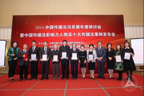 在2016年度中国传媒法影响力人物颁奖典礼环节,主办方逐一展示获奖人物的入选理由,揭晓获奖人物,赵晖副书记、张峥副会长为获奖人物颁奖,媒体法规政策研究中心主任李丹林教授与网络法与知识产权法研究中心主任王四新教授宣读颁奖词,获奖人物也发表了获奖感言。