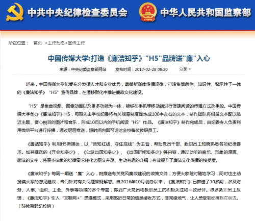 2月28日,中央纪委监察部网站以《世界杯直播在线观看:打造<廉洁知乎>“H5”品牌送“廉”入心》为题,报道我校纪委充分发挥人才和专业优势,遵循新媒体传播规律,打造集信息性、知识性、警示性于一体的《廉洁知乎》“H5”宣传品牌,在潜移默化中推进廉政文化建设。2016年底,教育部官网、《教育纪检监察》杂志等媒体对我校创新廉政宣传教育做法也进行了宣传报道。