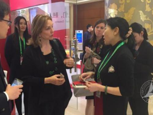 章文舟老师与美国中国协会会长施静书Josette Sheeran在大会现场沟通