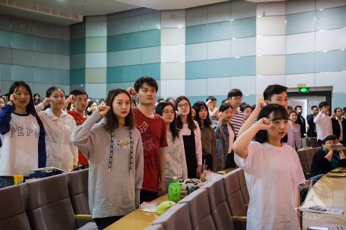 会议上,在艺术学部2014级文艺编导专业孙宇同学的领誓下,在场全体青年团员进行了入团宣誓,重温入团誓词。