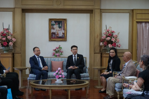在泰国期间,代表团还拜访了中国驻泰国大使馆。宁斌魁大使亲切会见胡正荣校长一行。胡校长汇报了学校发展及本次出访情况,希望与使馆加强合作,利用学校优势资源为使馆的人员培训、相关会议等提供服务。宁斌魁大使高度赞赏胡校长的建议,表示将积极支持学校与泰国高校及相关机构的合作,愿为之牵线搭桥,促进学校办学的国际化。