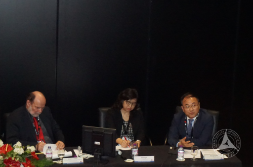 随后,代表团访问了泰国综合实力最强、办学水平最高的国立大学——朱拉隆功大学。该校校长班迪·厄阿蓬(Bundhit Eua-arporn)教授及传播艺术学院院长帕里差·萨皮塔农达(Parichart Sthapitanonda)、国际事务办公室主任卡乌贾·拿卡斯库(Kaewjai Nacaskul)等与代表团热情会面。胡正荣校长与厄阿蓬校长进行了深入、愉快的交谈,达成了诸多共识。双方均表示,要建立密切联系,在相关学科、专业领域进行实质性办学合作,共同举办“一带一路”国家大学生影视节,并开展暑期学生交流,从而携手推进两校及亚洲大学的发展。之后,在两校校长的见证下,我校艺术学部等与朱拉隆功大学传播艺术学院签订了合作办学协议。