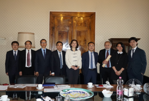 5月7日,代表团抵达意大利罗马。代表团首先访问了我校的传统合作院校——佩鲁贾外国人大学,受到该校校长吉尔瓦尼·派修罗(Giovanni Paciullo)教授、意大利语教授莉迪亚·科斯塔马那(Lidia Costamagna)、中国合作项目负责人爱丽力·切凯蒂(Erica Cecchetti)等的热情接待。胡正荣校长与派修罗校长回顾了两校友好合作的历程,对彼此给予的支持与配合表示感谢。双方均表达了面向未来、深化合作的强烈愿望,愿在保持传统项目合作的基础上,积极开辟新的合作领域。胡校长表示,我校有多个优势学科和专业能够提供英语教学,汉语教学和中文教育也别有优势,希望两校师生能够进一步开展“双向交流”。派修罗校长重点介绍了“一站式直通”升学计划项目情况,愿在此基础上,为我校学生,尤其是艺术类学生,开展更为便捷的语言类预科服务,以及实施“双学位”培养计划。双方对新的合作愿景表示乐观,愿加快推进实施。