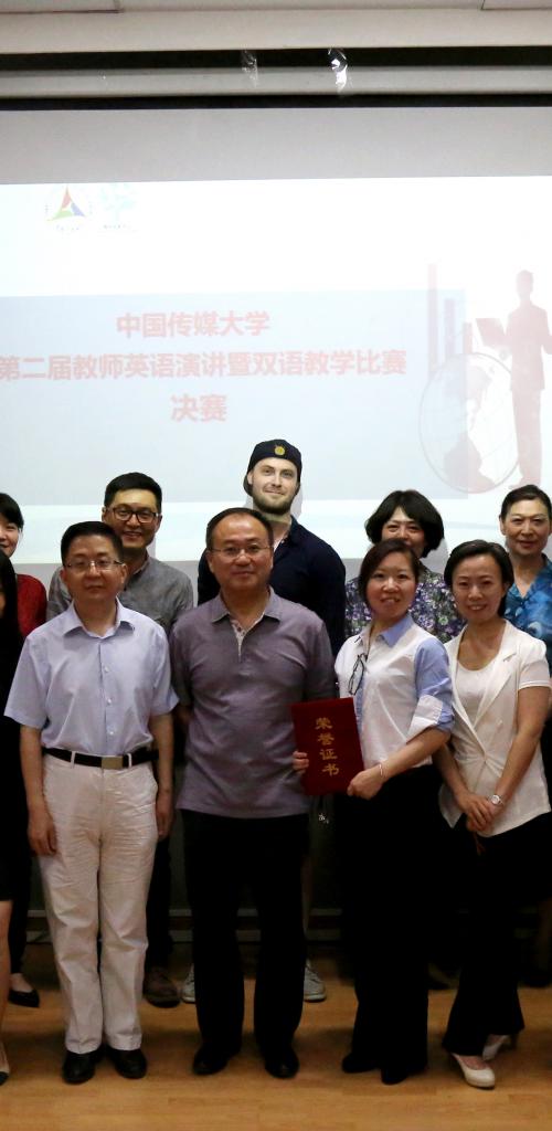 本次活动由人事处教师发展中心主办,比赛分为初赛和复赛,来自学校8个教学单位推荐的15名非英语专业教师参加了初赛,9位老师以优秀的成绩晋级决赛。决赛邀请了7位校内外的知名专家,中国人民大学外国语学院郭英剑教授,外交学院王燕教授,中国国际广播电台英语频道round table主持人Ryan,北京第二外国语学院英语学院龙云教授和宿荣江教授,以及我校外国语学院院长李佐文教授、新闻传播学部副学部长吴敏苏教授组成决赛评委团。