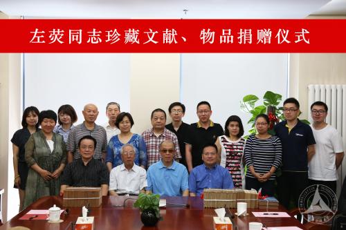随后,袁军副校长代表学校接受由左荧同志家属代表左太行先生捐赠的左荧珍藏文献和物品,并为其颁发捐赠证书。
