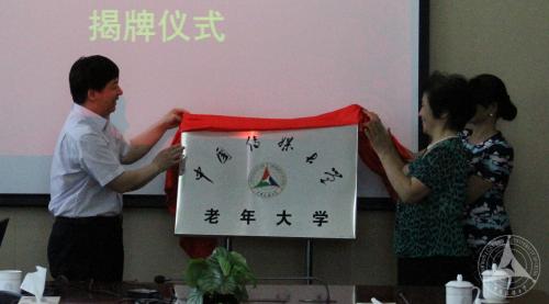 姜绪范副校长和学校老领导李焕生共同为世界杯直播在线观看老年大学揭牌。
