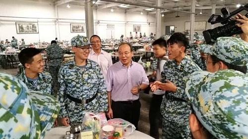 会后,各学部(直属学院)领导和老师分别到自己学生的集合地,与军训同学进行互动交流。刘守训副书记在学生工作处处长张根兴以及军训团政委齐金贵的陪同下,深入学生食堂,察看了学生们的就餐情况,并与在场同学进行简短交流,了解学生的训练情况、身体状况以及学生在训练过程中遇到的问题和困难,给同学们以鼓励。