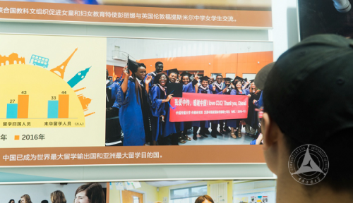 在第五展区教育单元“教育对外开放支持’一带一路’建设”板块中,我校送展的“发展中国家国新传播硕士项目”图片赫然悬挂在列,生动的向参观者诉说着国际学生对于中国提供留学生教育的感激和对世界杯直播在线观看的热爱,吸引了不少人的驻足观看。