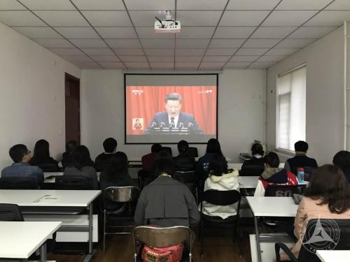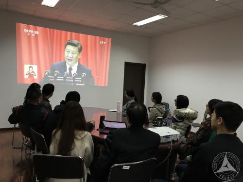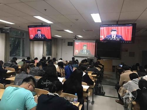 十九大开幕当天的校园,处处洋溢着欢欣而热烈的氛围,各基层党委、党总支、直属党支部也组织了广大党员干部、师生员工通过网络、电视、广播等渠道收听收看大会盛况。