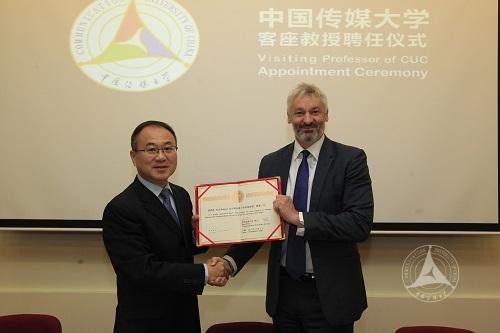 (通讯员 胡红英 摄影 周维一)11月1日上午,我校在东配楼116报告厅举行英国北安普顿大学校长尼克·派特福德(Nick Petford)客座教授聘任仪式。胡正荣校长出席聘任仪式并为派特福德教授颁发聘任证书。英国北安普顿大学国际部副主任张哲、我校博士生导师任金州、新闻传播学部副学部长何苏六、我校兼职教授严军琦等出席聘任仪式。人事处处长夏丹主持聘任仪式。