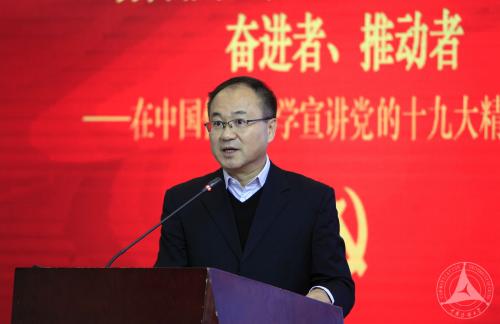 (新闻中心记者 阎玺 摄影 周维一)为深入学习、大力宣传、全面贯彻党的十九大精神,帮助广大干部全面准确领会把握党的十九大精神的思想精髓和核心要义,11月15日上午9:00,我校在中传国际交流中心3层M1会议室举办学习贯彻十九大精神宣讲报告会。北京市委常委、宣传部部长杜飞进作主题宣讲报告。